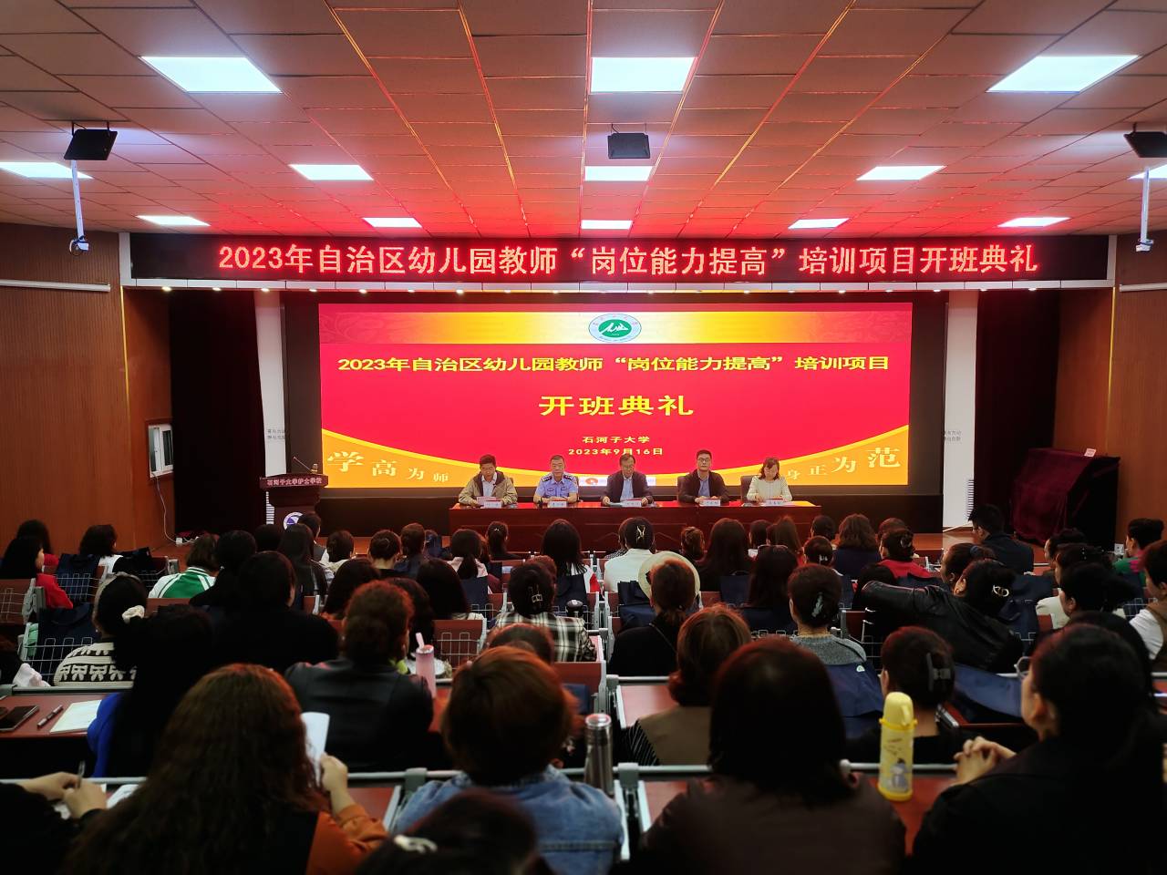 2023年9月16日上午,我院承办的自治区幼儿园教师“岗位能力提高”培训项目开班。兵团教育学院院长、石河子大学师范学院党委书记刘政江、石河子市公安局东明新村派出所所长李少峰、石河子大学护士学校领导、项目培训负责人、班主任及100名参训学员参加开班典礼。开班典礼由学院党委副书记叶壮主持。