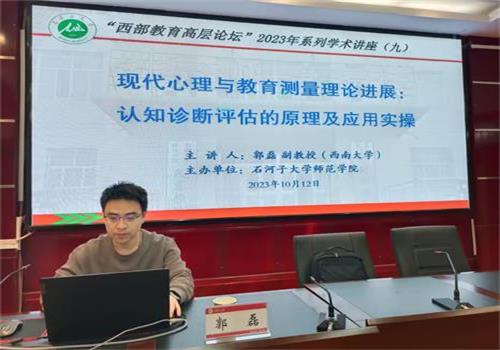 10月12日上午12:00,师范学院103学术报告厅,西南大学郭磊老师应邀以《现代心理与教育测量理论进展:认知诊断评估的原理及应用实操》为题,为学院带来了2023年第九场“西部教育高层论坛”学术讲座西南大学优秀教师郭磊副教授应邀做客我院“西部教育高层论坛”,开展2023年第九场学术讲座,为学院师生作题为《现代心理与教育测量理论进展:认知诊断评估的原理及应用实操》学术讲座,本次学术讲座由师范学院副院长朱海东副教授主持,学院全体教师、研究生及感兴趣的本科生听讲参加了本次讲座。