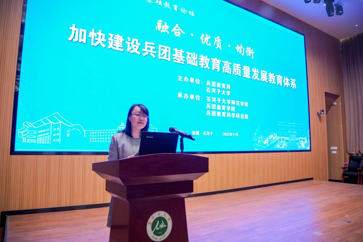 马春晖代表石河子大学对参加本次论坛的各位嘉宾表示热烈欢迎,对兵团教育局长期以来在推动高校学科专业协调发展、提升师范教育育人质量以及搭建UGS协同育人合作平台等方面的大力支持以及兵团教育局对石河子大学承办本次基础教育论坛的支持表示了感谢。他表示,此次兵团基础教育论坛的召开,对高校服务基础教育提出了新的要求:一是高校要重视人才培养,构建政府、高校和基础教育学校三方协同的育人机制;二是继续优化资源整合,构建面向高校与基础教育学校师生的科研创新团队;三是加快建设高校与兵团基础教育高质量发展的教育智库。石河子大学将始终秉承“以服务为宗旨,在贡献中发展”的办学理念,坚持正确的政治方向、保持学术的先进性和服务的有效性,推进自身师范教育现代化发展的同时积极带动兵团基础教育事业变革,助力兵团基础教育高质量发展。