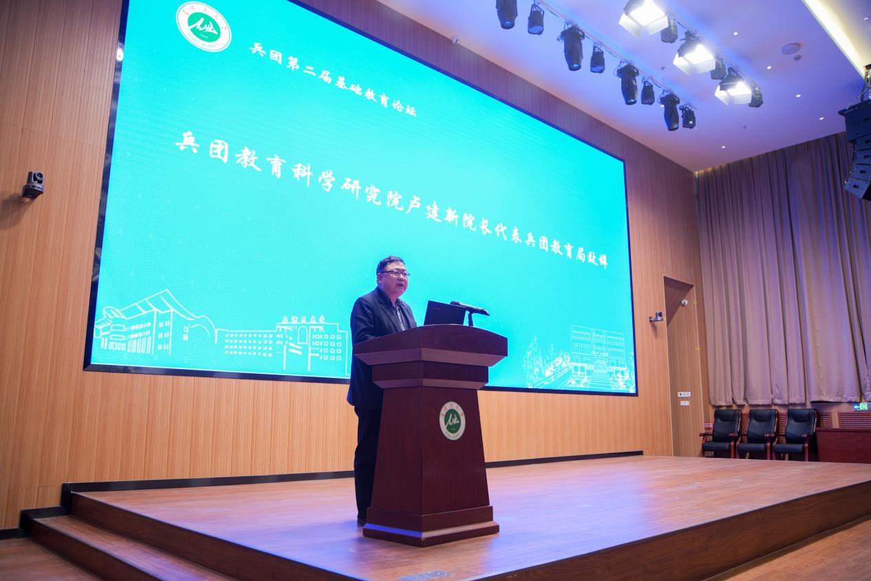 卢建新代表兵团教育局致辞,他表示,兵团第二届基础教育论坛是在兵团基础教育进入高质量发展阶段举行的一次重要活动,下一阶段的工作应重点围绕三点进行:一是搭建交流平台,推广成功经验;二是聚焦关键环节,深化专题研究;三是提高政治站位,增强工作实效。