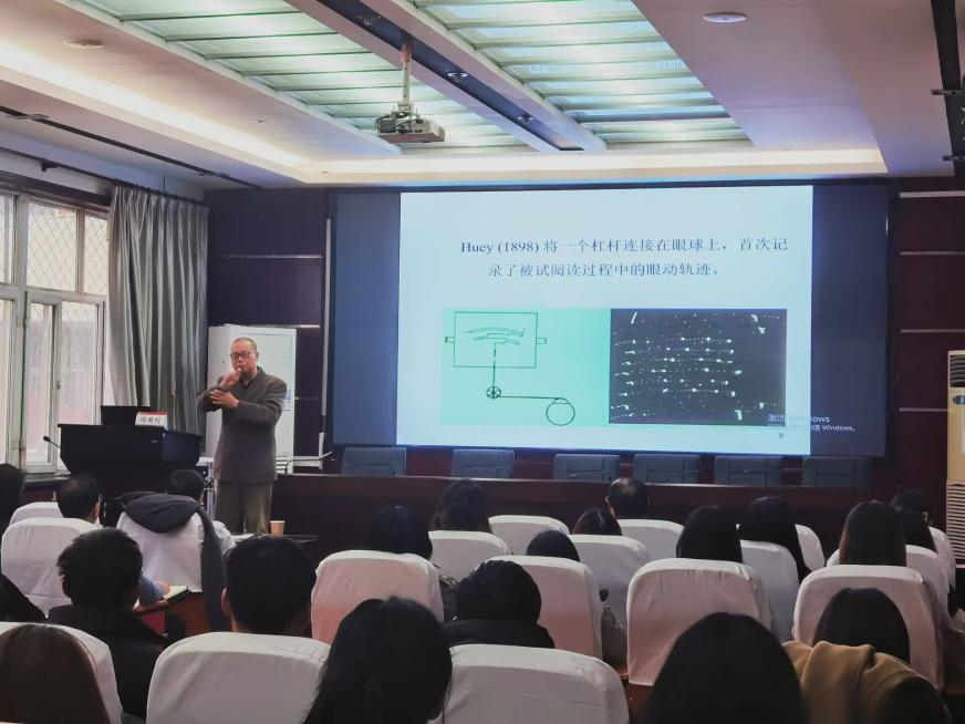 闫国利教授围绕眼动研究记录方法、学生汉语阅读的眼动研究及天津师范大学心理学部眼动团队介绍的三部分内容展开讲座。